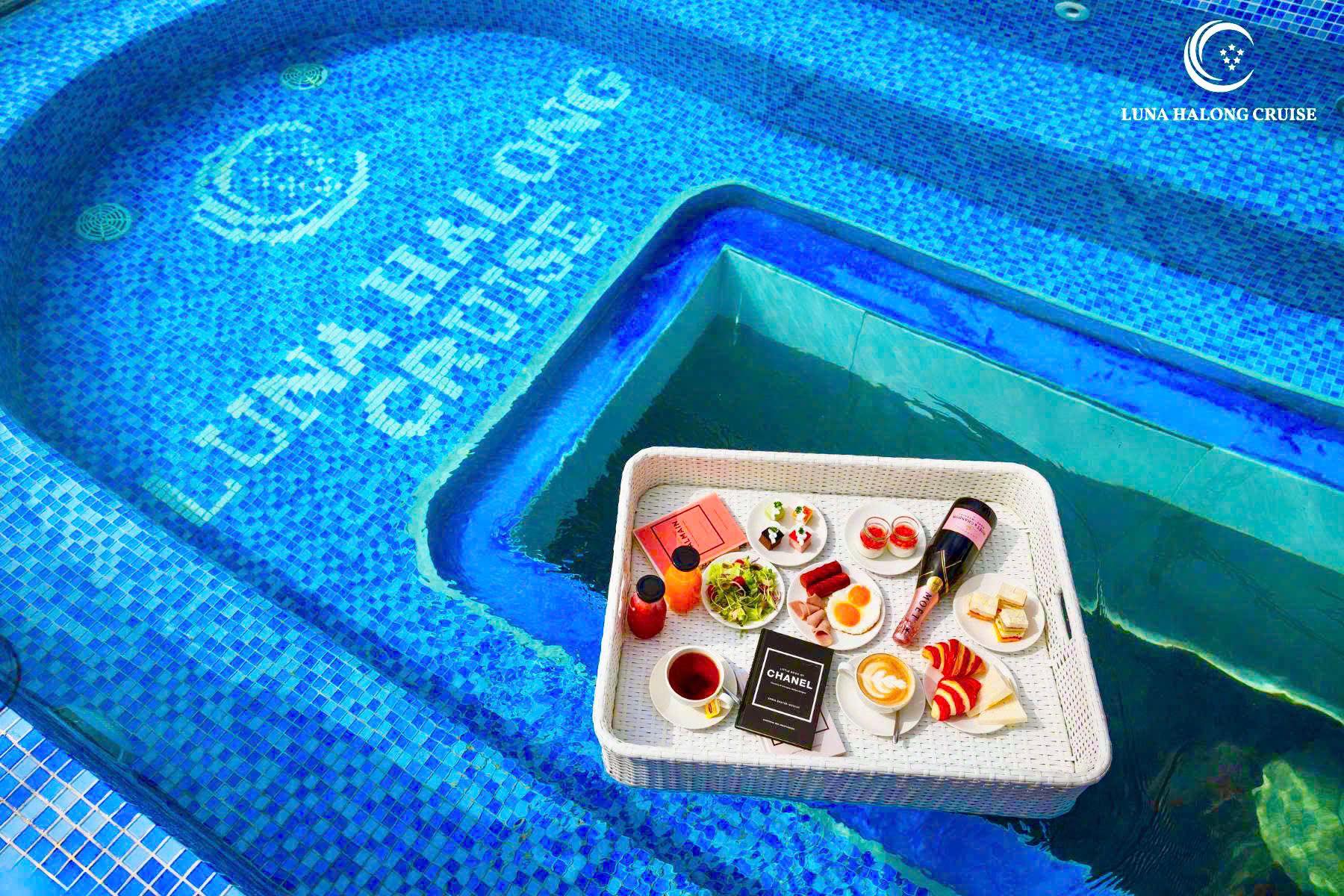 Tại đây, du khách có thể ngâm mình trong làn nước mát lạnh hoặc ngắm khung cảnh hoàng hôn trên Vịnh Lan Hạ – một trong những khoảnh khắc đẹp nhất của hành trình. Phía mũi tàu còn có sân golf mini, tạo nên trải nghiệm mới lạ tương tự các du thuyền ngủ đêm cao cấp.
