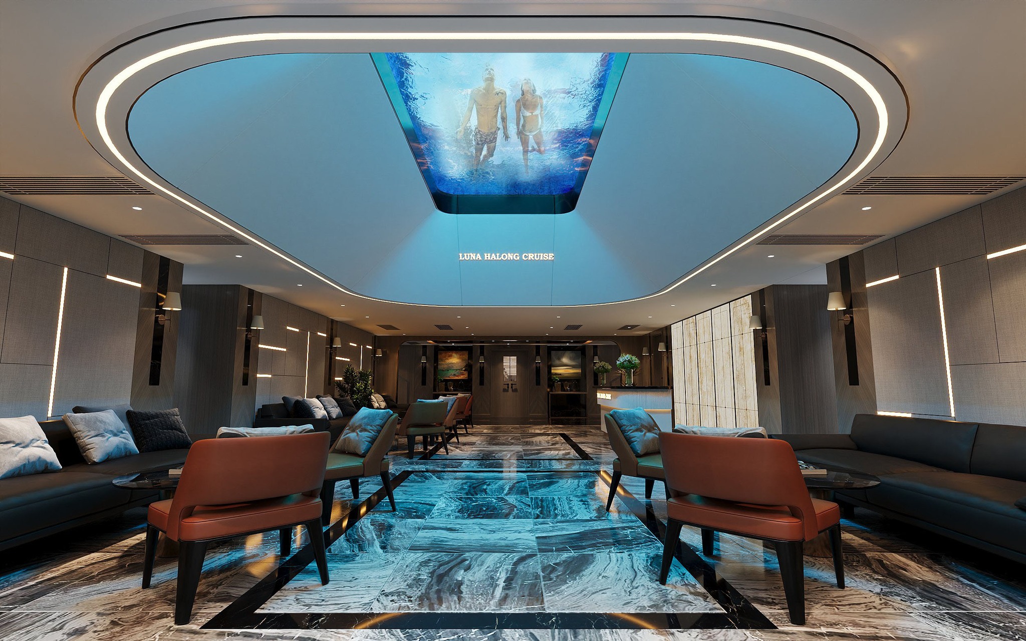 Tầng 1 và tầng 2 là khu vực trung tâm đón khách với sảnh lễ tân rộng rãi, thiết kế hiện đại, sử dụng vật liệu cao cấp và hệ thống ánh sáng ấm. Không gian được bố trí ghế chờ, quầy tiếp nhận và khu vực hỗ trợ khách hàng, đảm bảo quy trình check-in – check-out nhanh chóng và chuyên nghiệp. Sảnh lễ tân đóng vai trò là điểm kết nối giữa khu vực lưu trú và các tiện ích giải trí trên tàu.