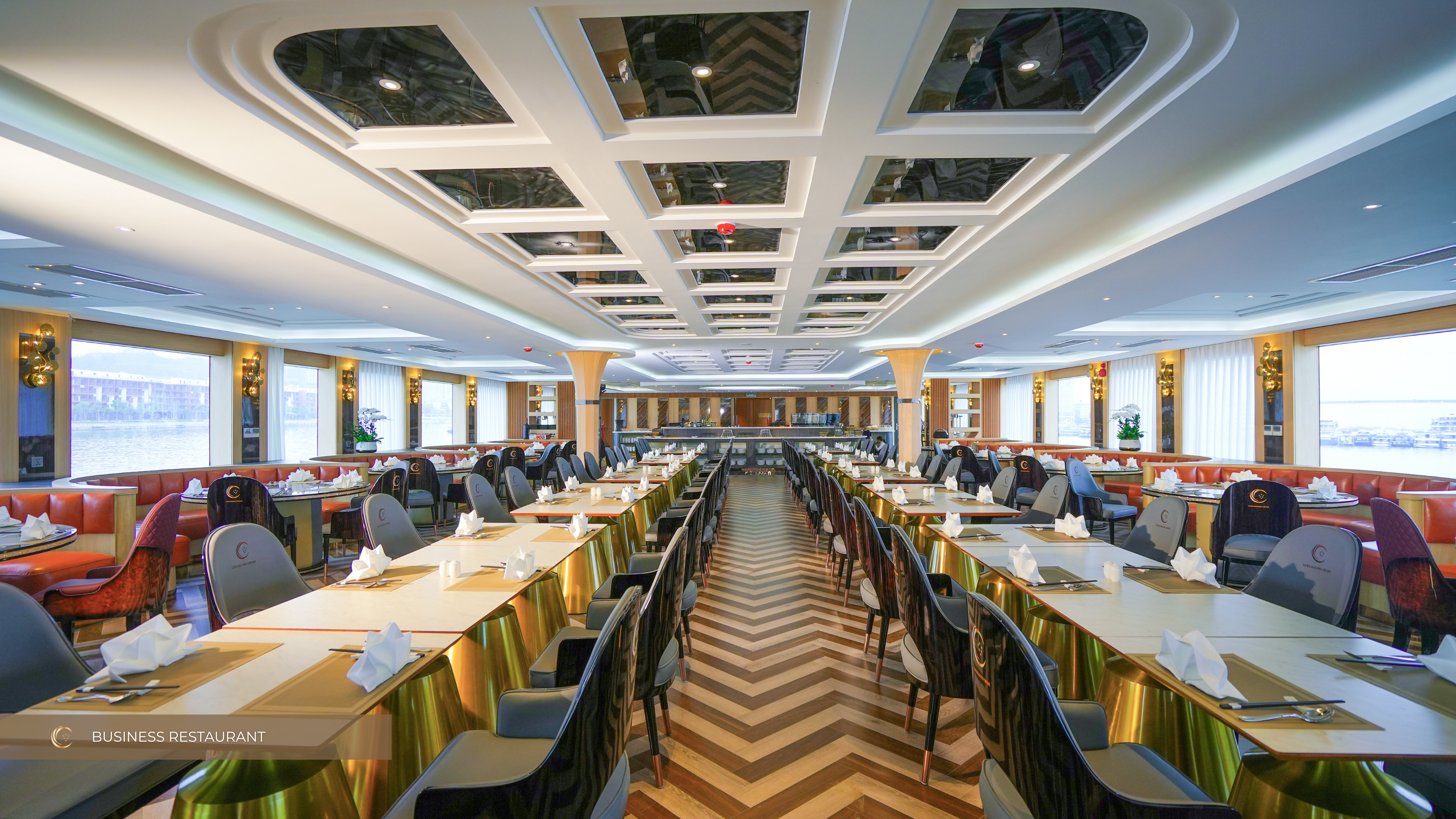 Tọa lạc tại tầng 4 của du thuyền Luna HaLong Cruise, nhà hàng Business mang đến không gian ẩm thực đẳng cấp với sức chứa lên tới 130 khách. Khác biệt với nhà hàng Luxury, Business là phân khúc cao cấp hơn, được thiết kế với tone màu ấm áp, nội thất tinh xảo và phong cách bài trí sang trọng. Mỗi bàn tiệc được set up kỹ lưỡng, thể hiện sự chỉn chu trong từng chi tiết.