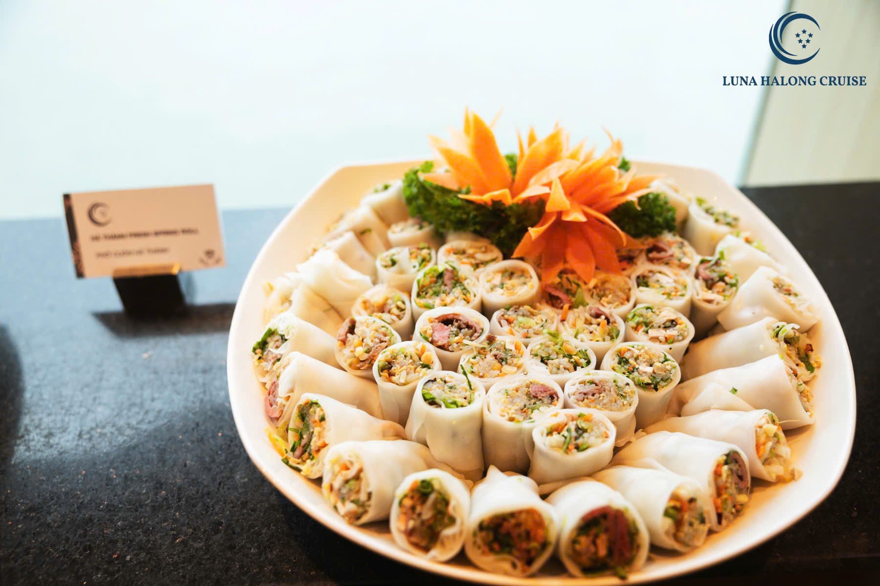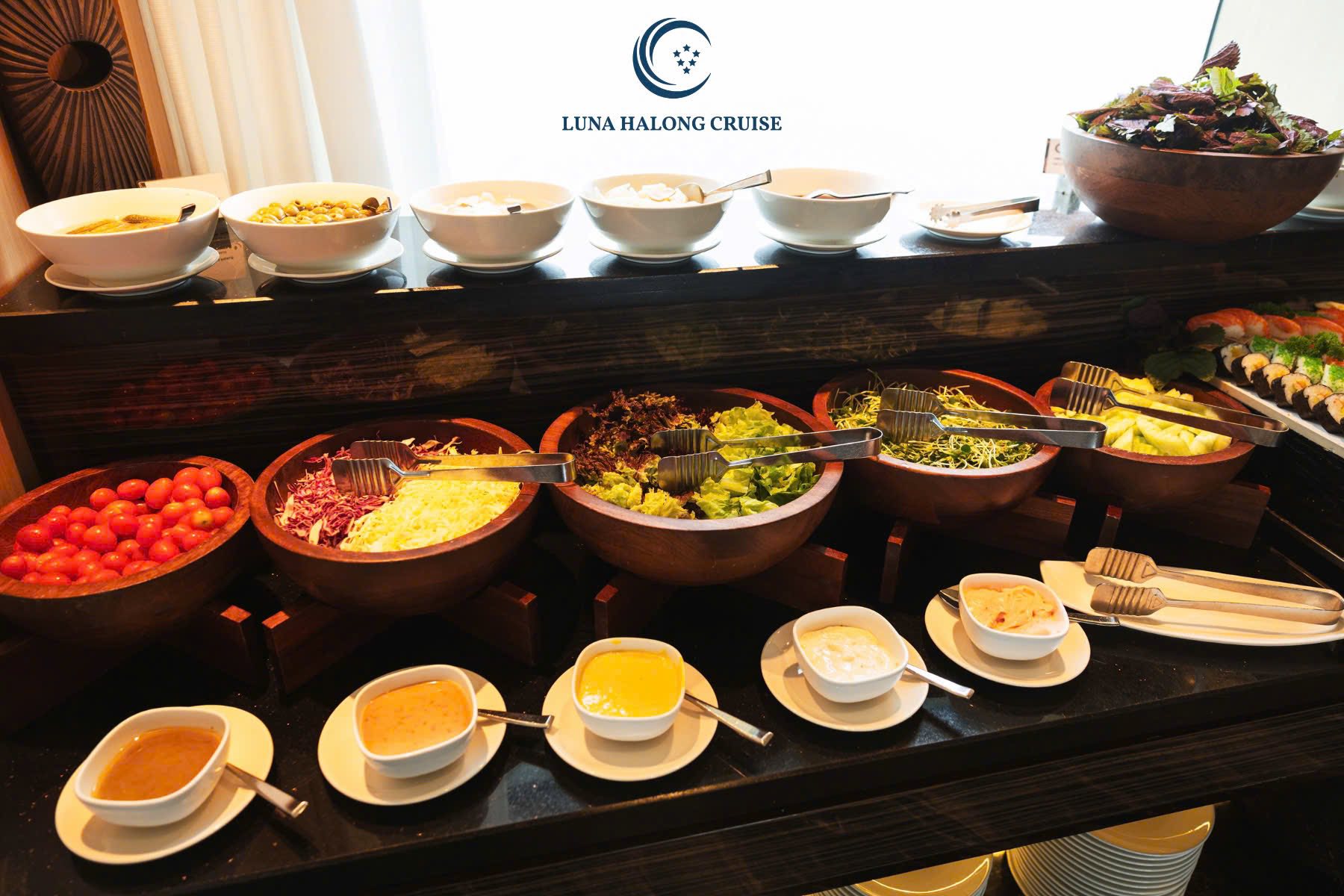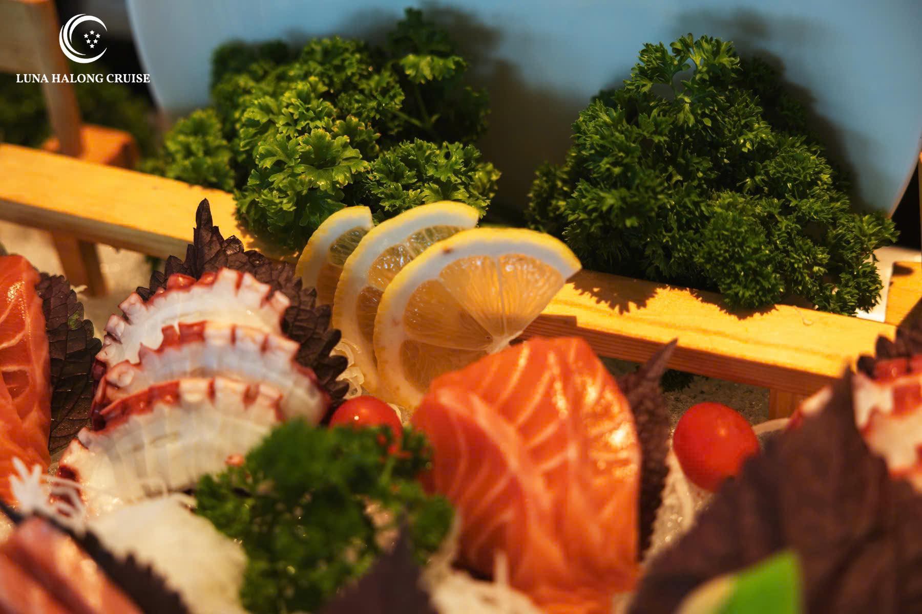 Một trong những điểm nhấn khó quên trong hành trình cùng Luna HaLong Cruise chính là buffet gần 100 món Á – Âu được chế biến công phu, kết hợp tinh hoa ẩm thực truyền thống và hiện đại. Từ sushi tươi ngon, hải sản hấp dẫn đến các món Âu cao cấp như beefsteak, pasta hay salad phong cách Địa Trung Hải – tất cả đều được các đầu bếp 5 sao chăm chút tỉ mỉ, mang lại hương vị hài hòa và tinh tế.