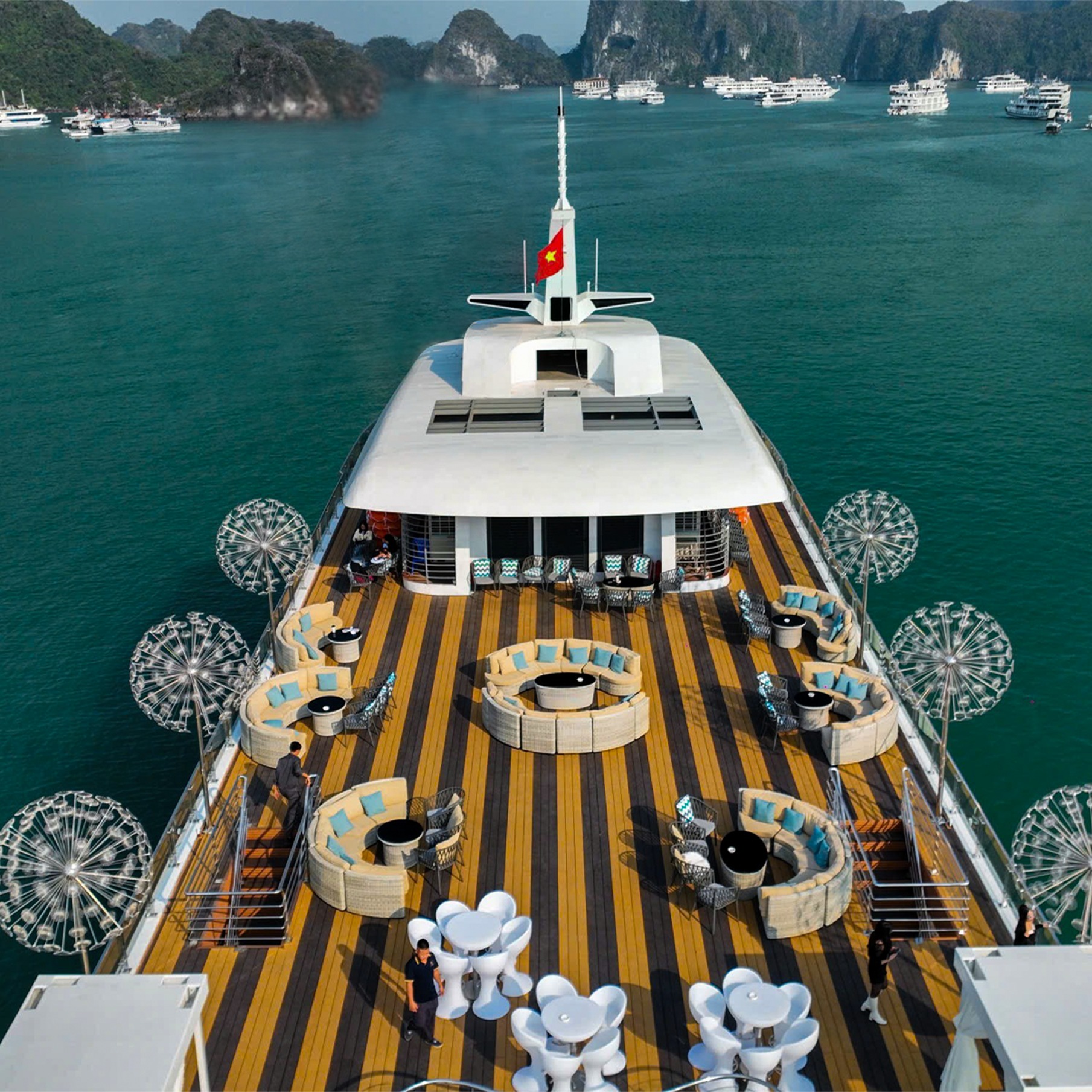 Du thuyền sở hữu trong mình các tiện nghi sang trọng, nhà hàng cao cấp, Sundeck 360 độ bao trọn cảnh vịnh Hạ Long, bể bơi lớn ngoài trời đáy kính đầu tiên đem đến trải nghiệm vô cùng thú vị. Quầy bar, spa, phòng nghỉ đều rất sang trọng và đẳng cấp.